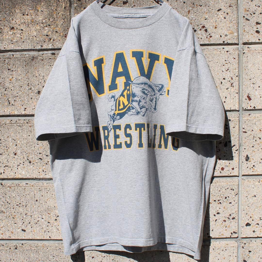 映画などで題材にされることの多い部隊の育成学校、アメリカ海軍兵を育成する学校のレスリングチームの古着 Tシャツになります。