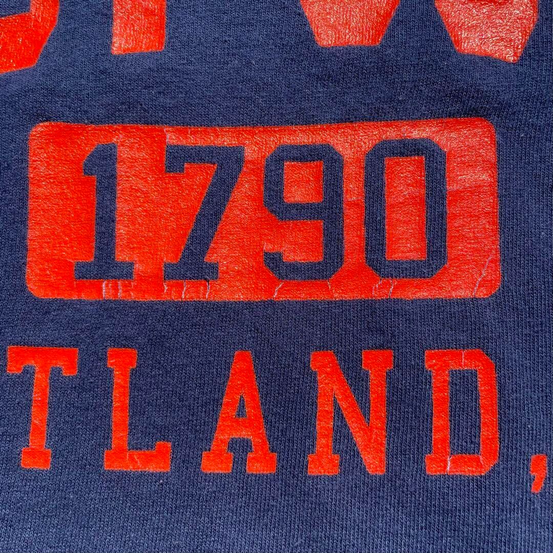 ネイビーのボディにオレンジが大変映える古着らしいデザイン Tシャツになります。