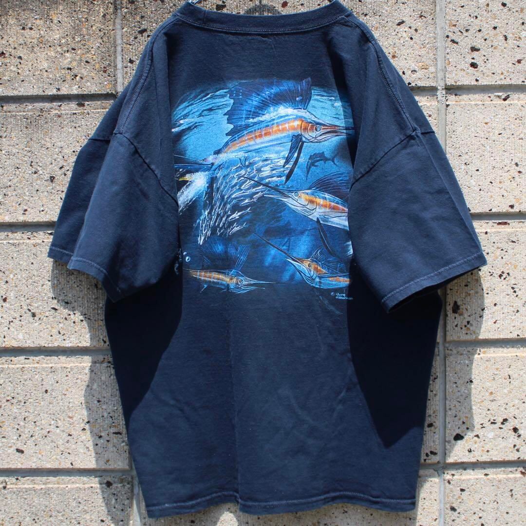 釣りをしているルアーに反応しそうなカジキマグロの群れの海の中の様子をデザインしたXXLサイズ 丈 身幅などしっかりサイズ感のある、ビッグサイズ 古着 Tシャツ になります。