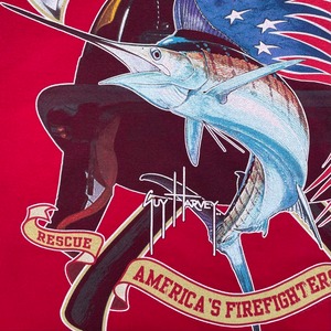 おそらくGuy Harvey ORIGINAL × 消防士さんに敬意を込めて独立記念日や、アメリカでの消防に関する10月9日の"火災予防デー"、10月8日~の1週間"防火週間"などの日に合わせて製作販売されたものになると思われます。