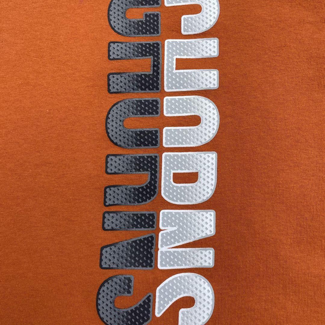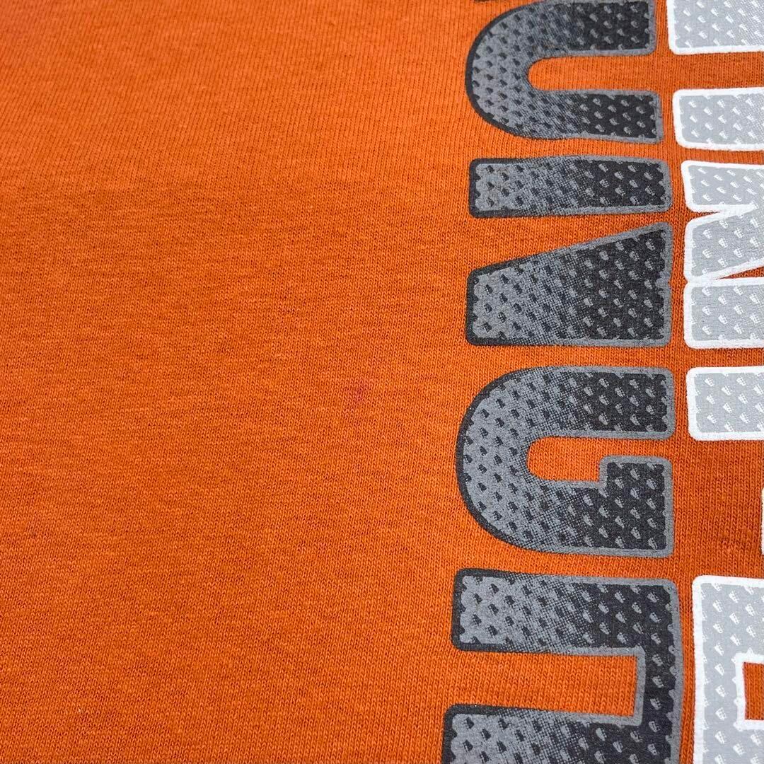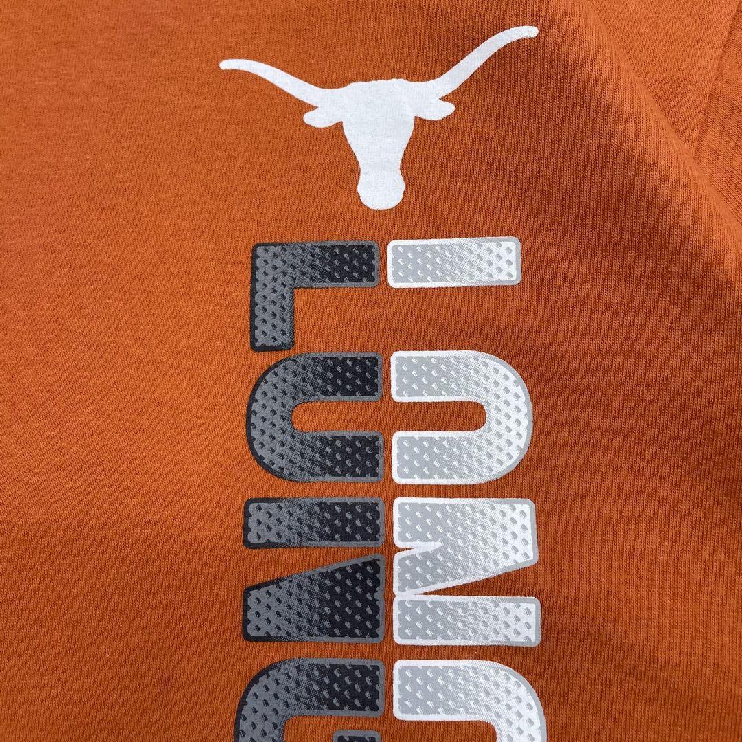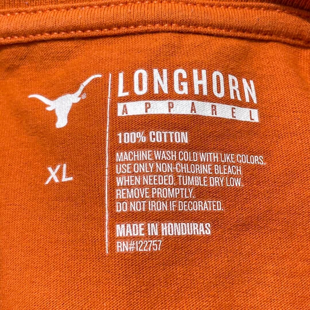 テキサス大学 スポーツチーム "LONGHORNS ロングホーンズ" チームロゴ入り、カレッジカラー XLサイズ 丈 身幅のある大きめサイズの古着 Tシャツ になります。