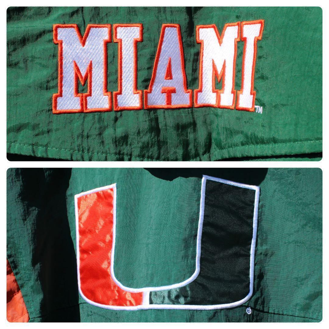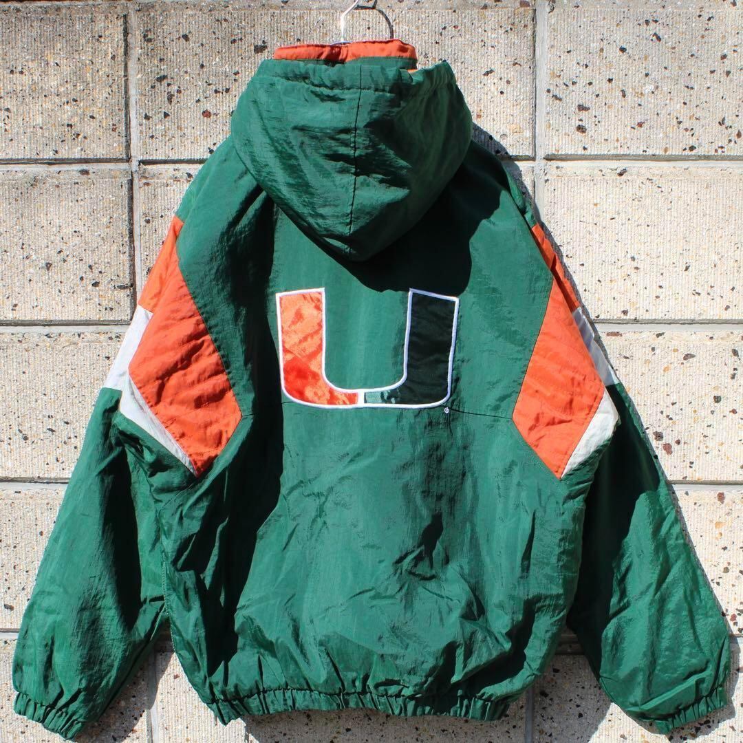 全体がカレッジカラー、前後にMIAMI カレッジロゴがが大きく入るゆったり大きめサイズの古着 アノラックになります。