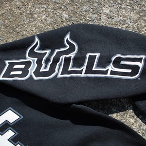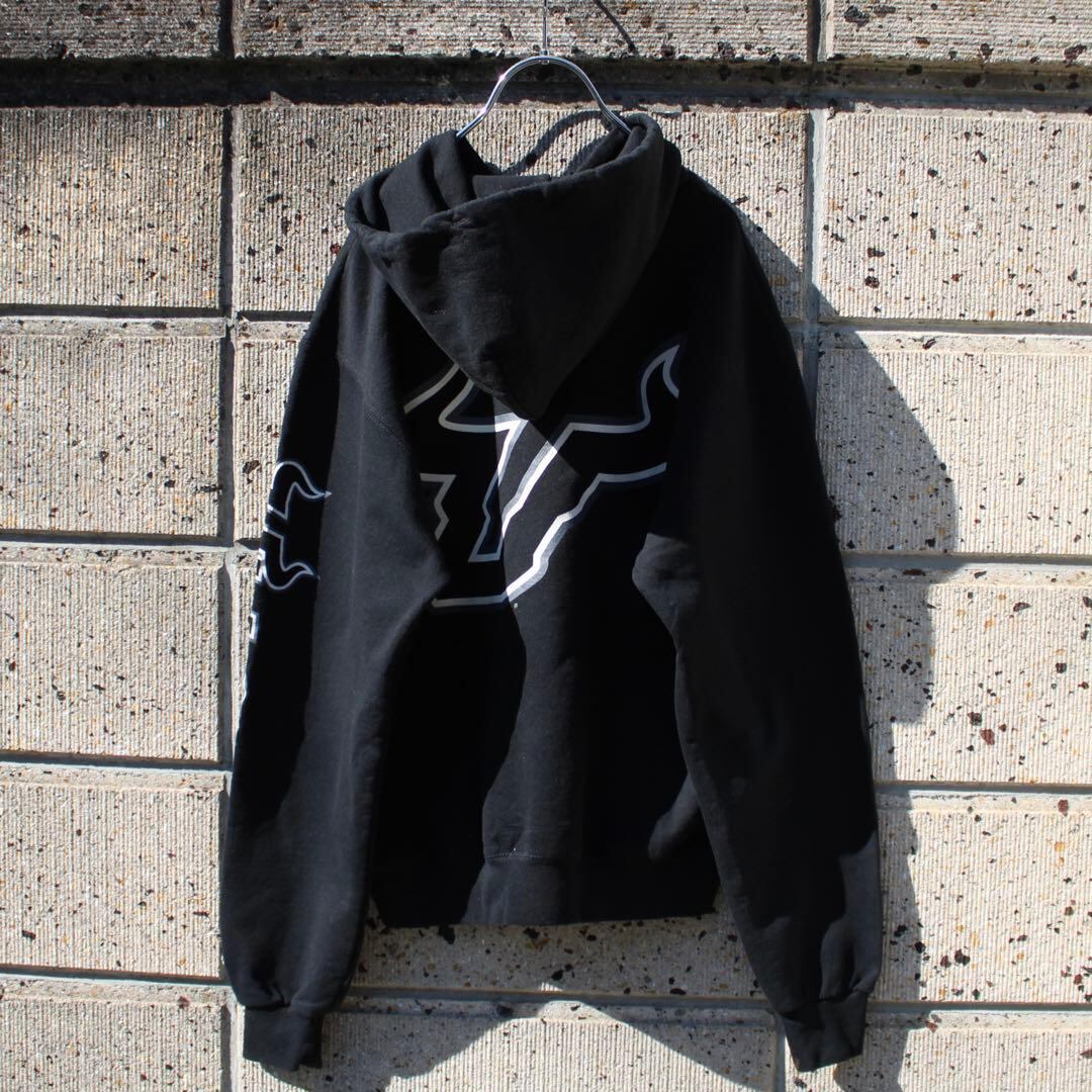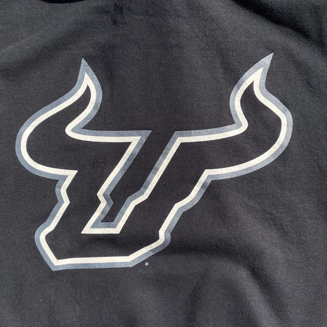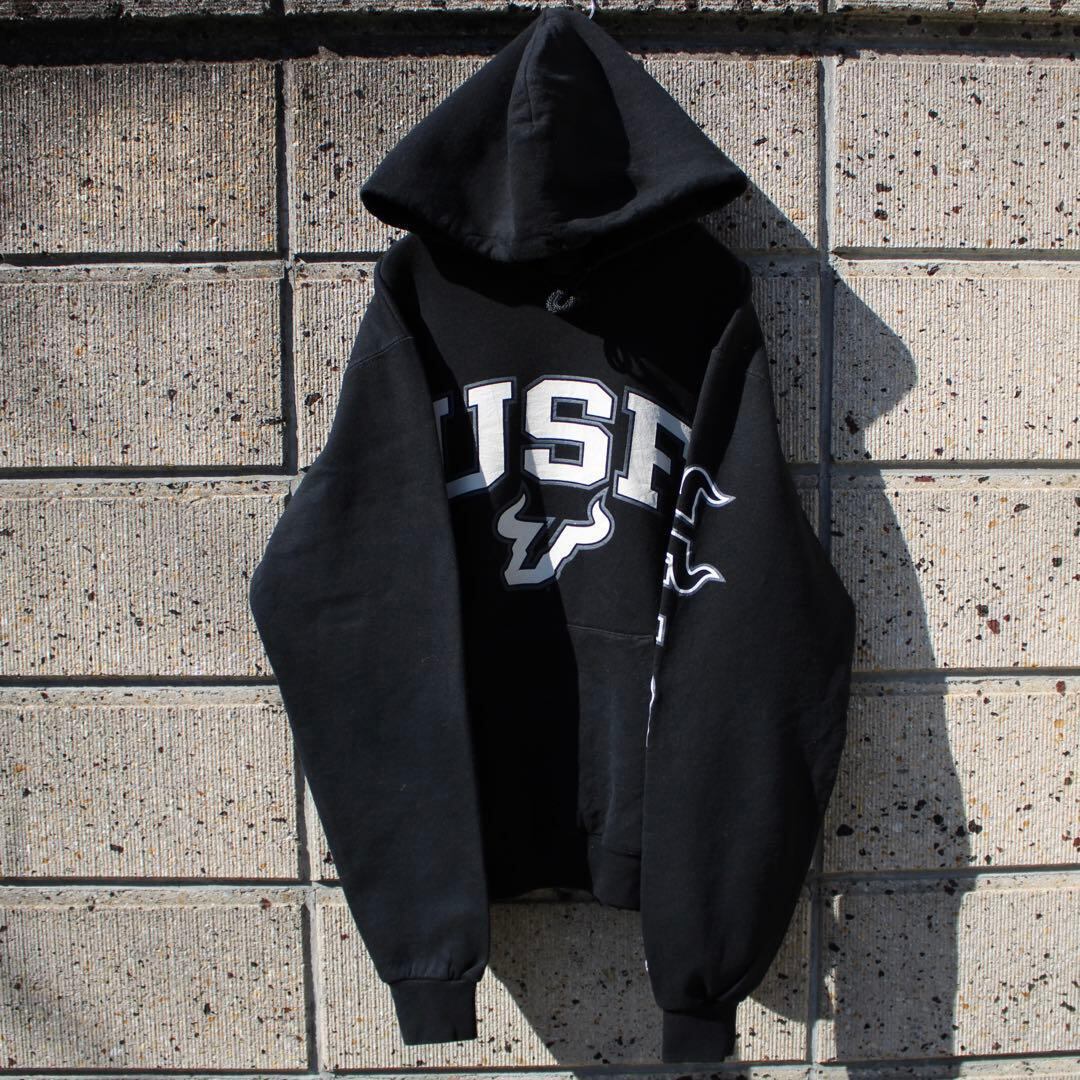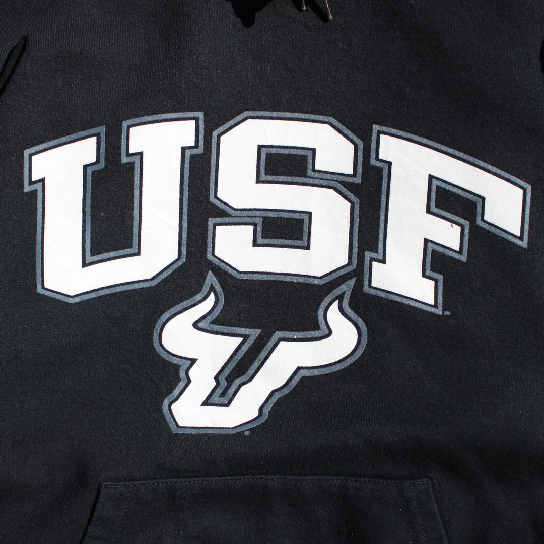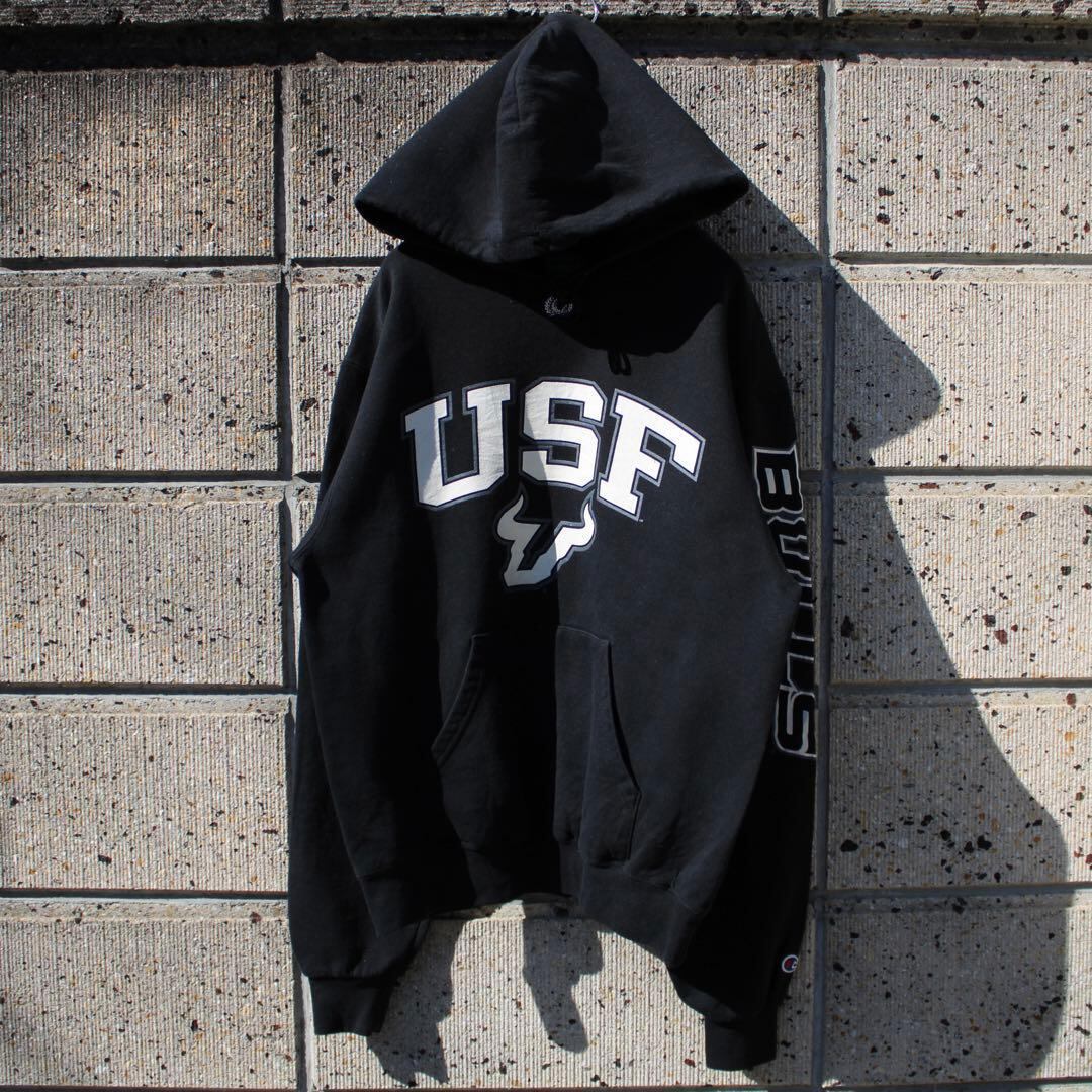 Champion US企画 × USF 南フロリダ大学 スポーツチーム"ブルズ"の各所にロゴやチーム名のデザインが入った古着 パーカー になります。