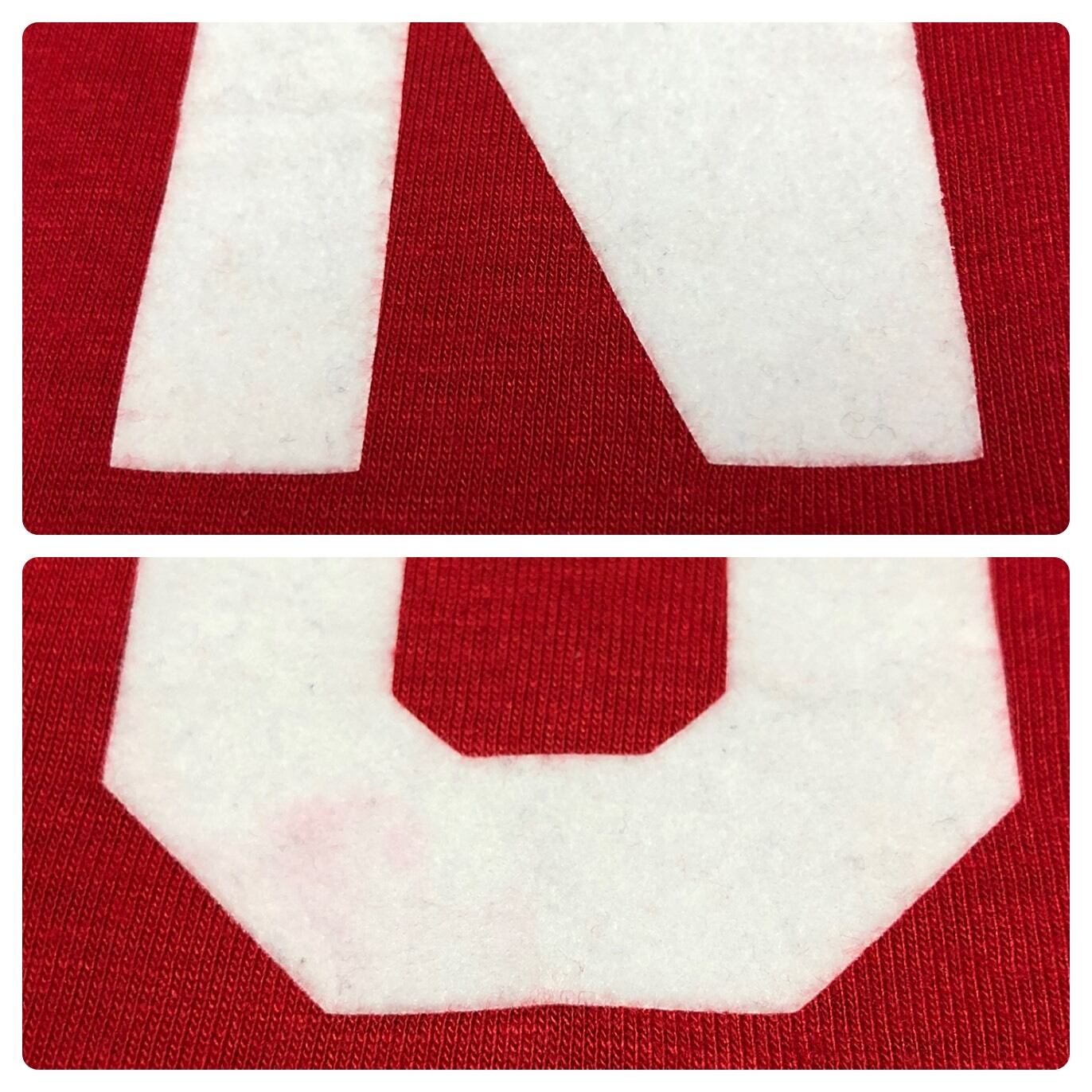 前後の文字はフェルト調の文字プリント、前後のキャラクターはツルツルのプリントになります。