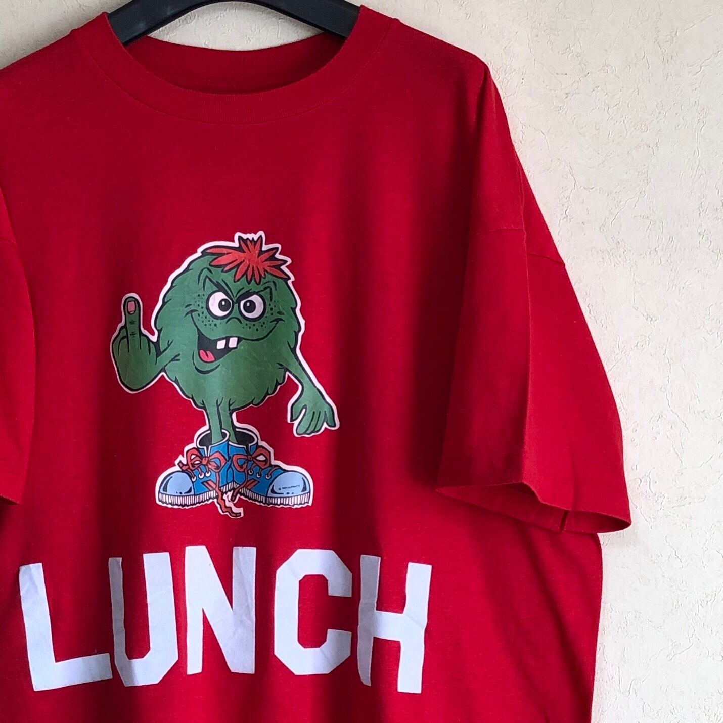 中指を立てたアメコミキャラクターと"LUNCH"の文字が入っています。