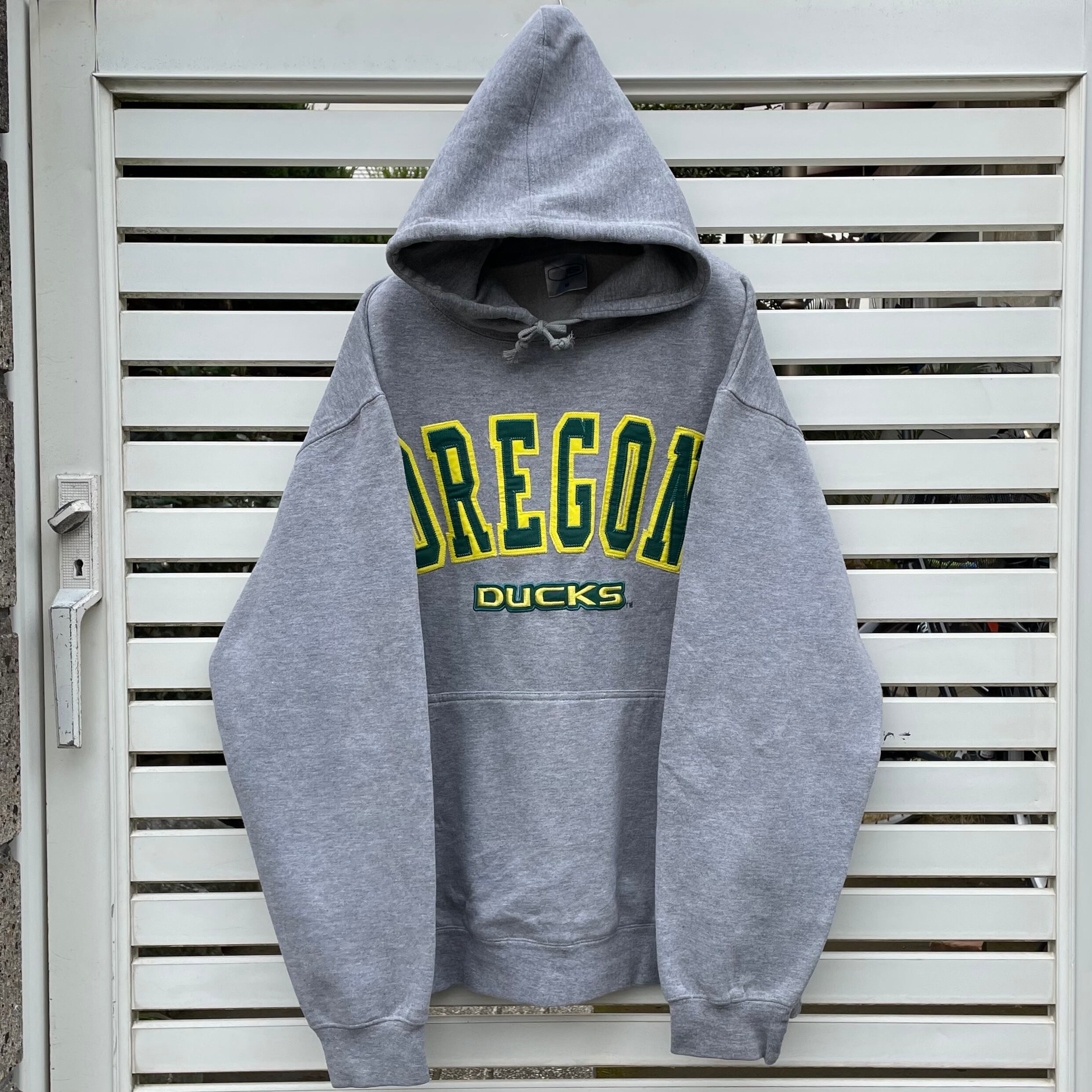 【Mサイズ】"OREGON DUCKS" 文字ワッペン カレッジ パーカー 灰×緑×黄 USカレッジもの
