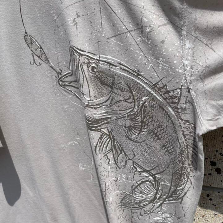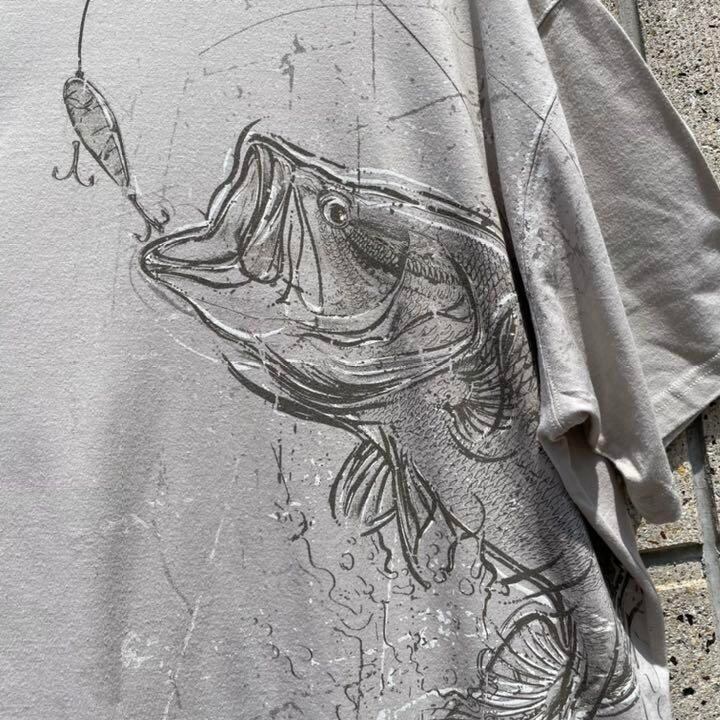 とても柔らかく触り心地の良い生地に、ブラックバスがルアーを捕食するバイトシーンが大きくプリントで入る古着 Tシャツになります。