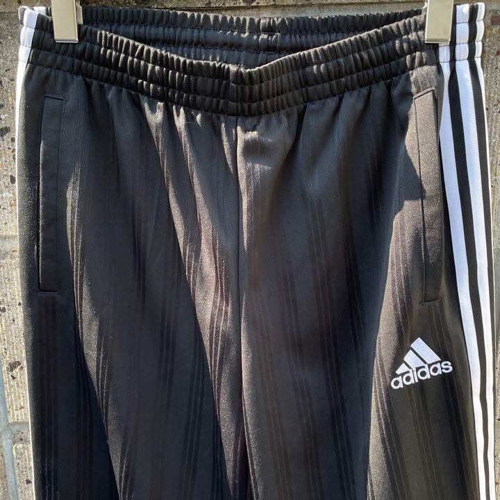 adidas 00s ロゴ刺繍 3本線 黒×白 の定番人気モデル、流行り廃りなく1年通して履いて頂ける古着 トラックパンツになります。