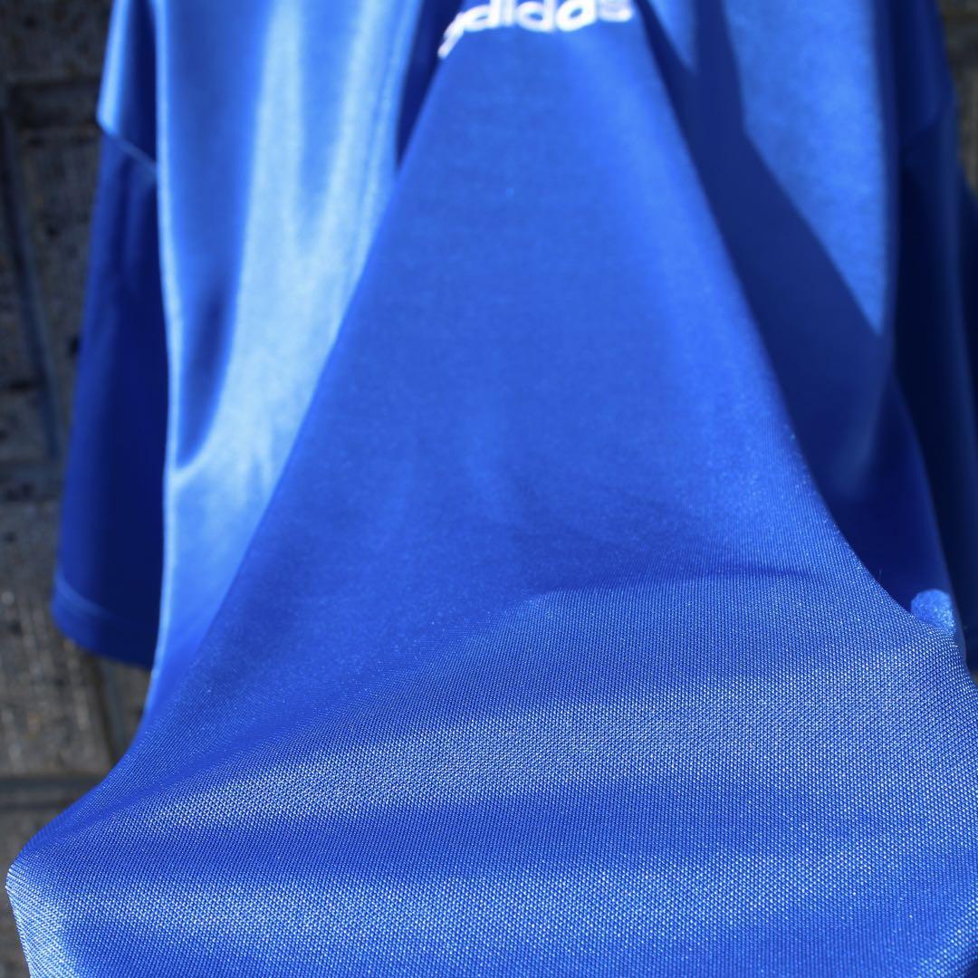 ツヤのあるゲームシャツのような生地に襟、襟元にadidasの刺繍がワンポイントしっかり入るトレーニング用ジャージ/ゲームシャツの古着 になります。