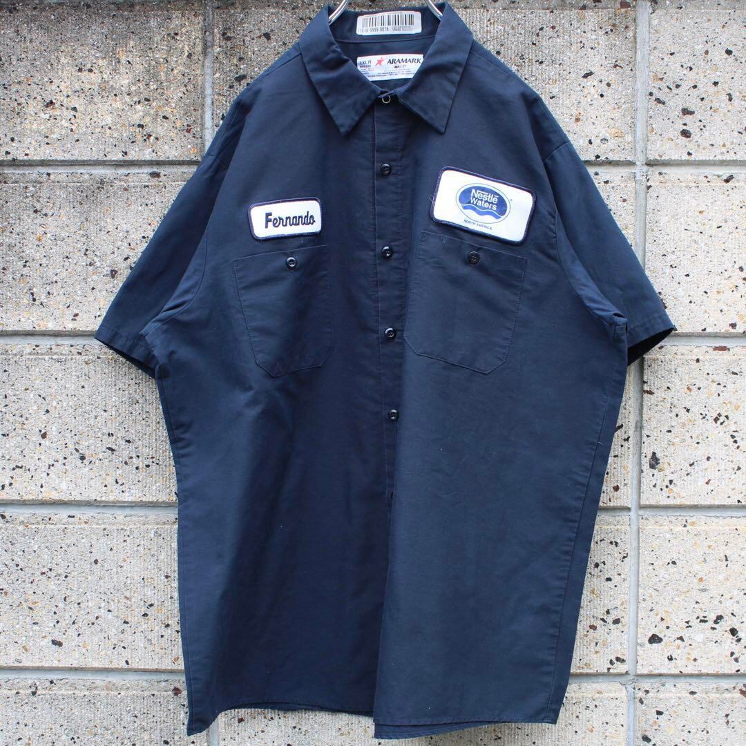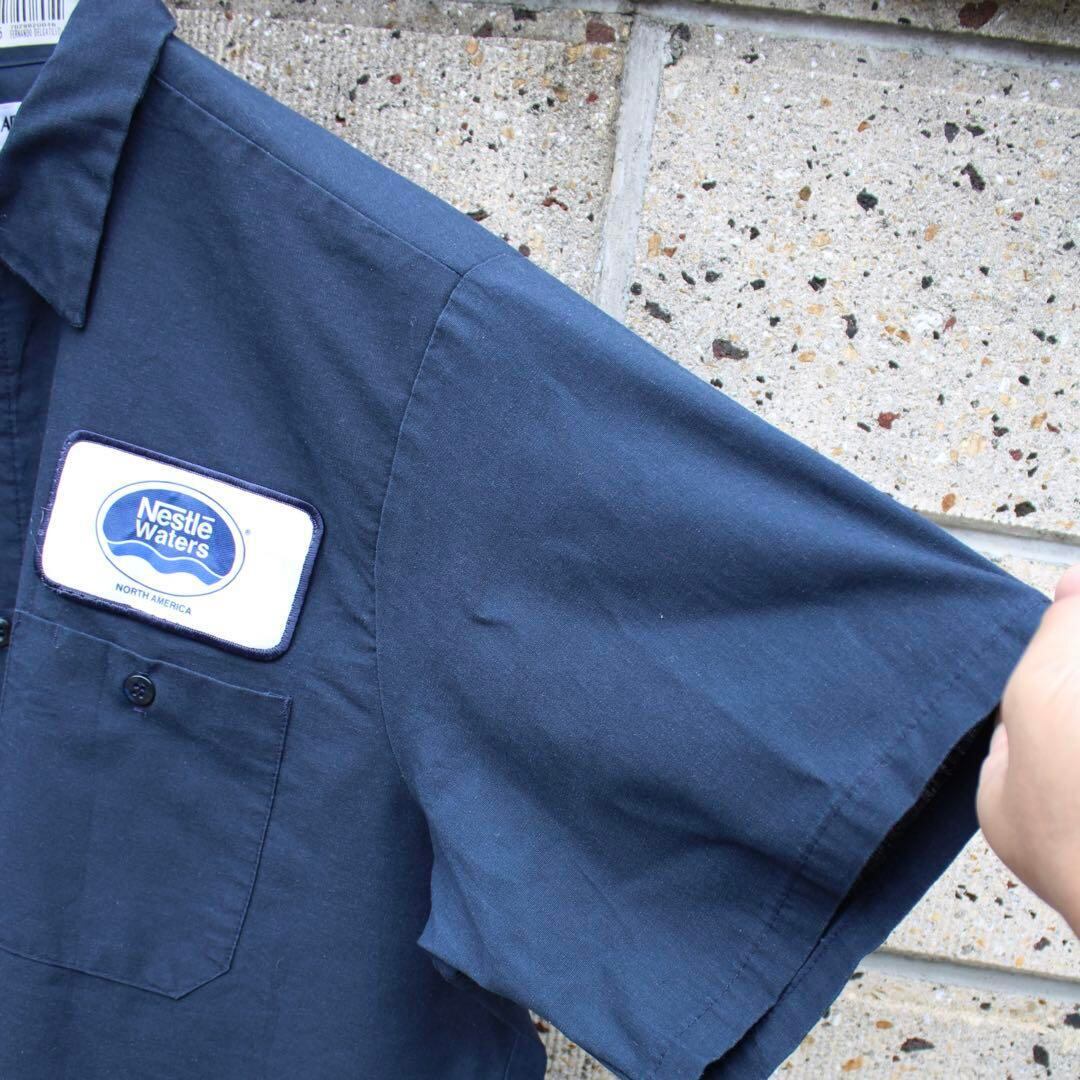 ARAMARK社 濃紺のワークシャツに"Nestle Waters"の文字が入るワッペンがしっかり付いた定番パターンの古着 ワークシャツになります。