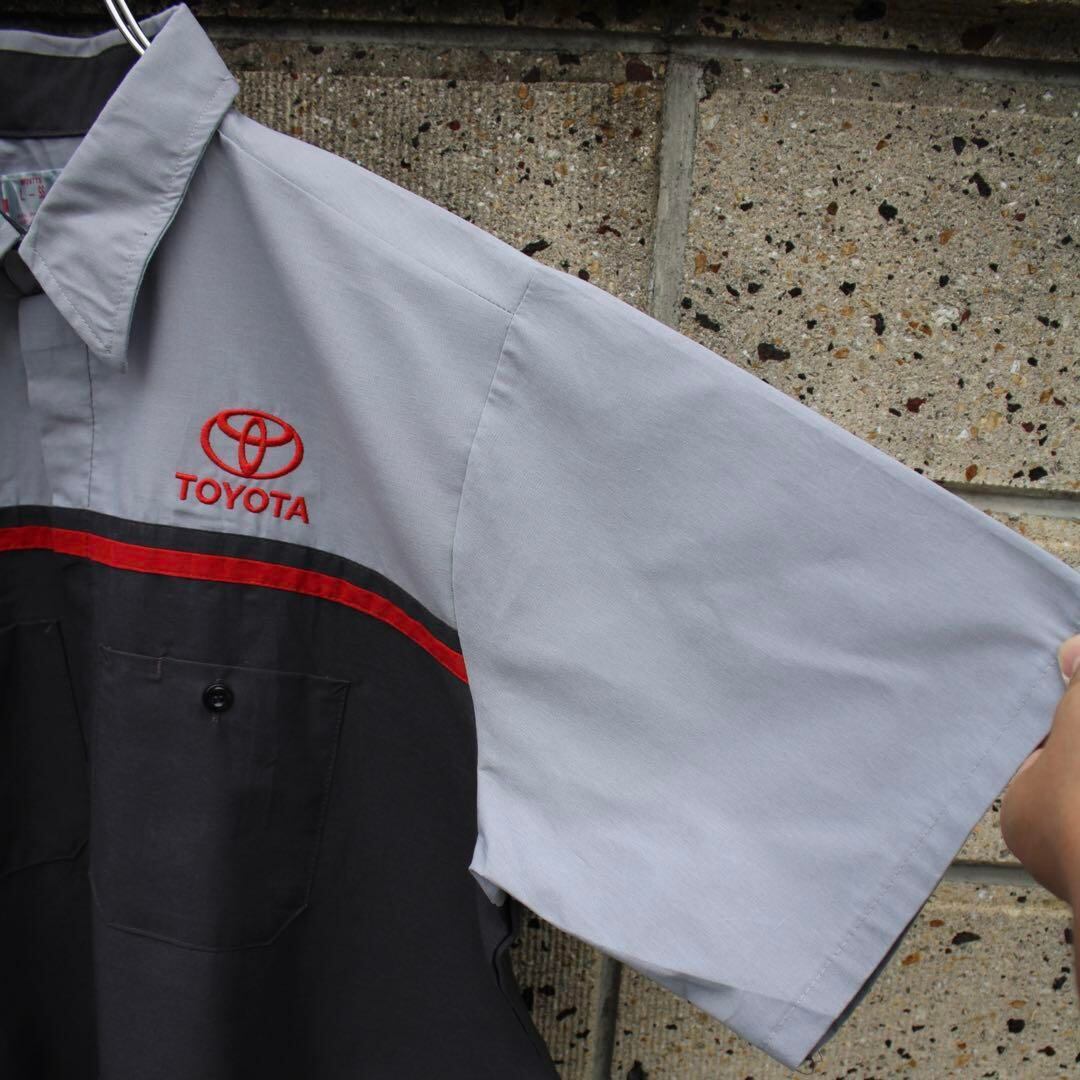 定番 TOYOTAのエンブレムロゴが胸と背中にしっかり刺繍で入る古着 ワークシャツになります。