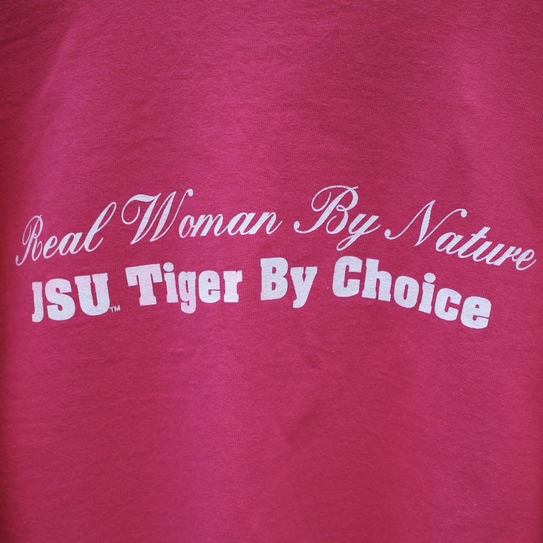 →米国ミシシッピー州にあるジャクソン州立大学 のスポーツチーム タイガースのTシャツやグッズを持った女性3人がプリントされた古着 Tシャツになります。