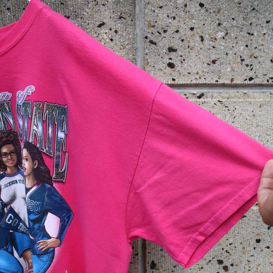 ジャクソン州立大学 大学の特徴と大学のスポーツチームを応援する3人の黒人女性がポップにシティ感溢れるデザインに落とし込まれた、XLサイズ ゆったり大きめサイズ デザイン サイズ感の良い、古着 Tシャツになります。