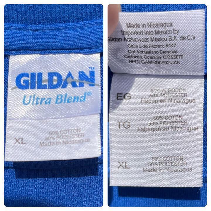 古着らしいブルーに濃いイエロー×ホワイトのプリントというよりはペンキで塗ったようなプリントの入り方のXLサイズ クルーネック Tシャツになります。