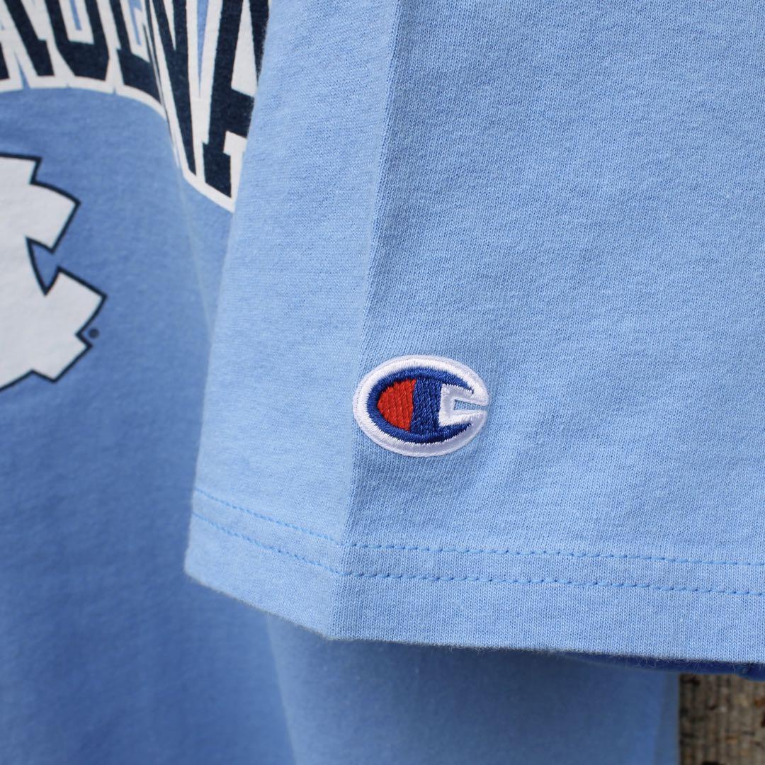 Champion × ノースカロライナ大学のカレッジカラーを基調に、カレッジ名 ロゴが前面に入るアイコニックな1着。